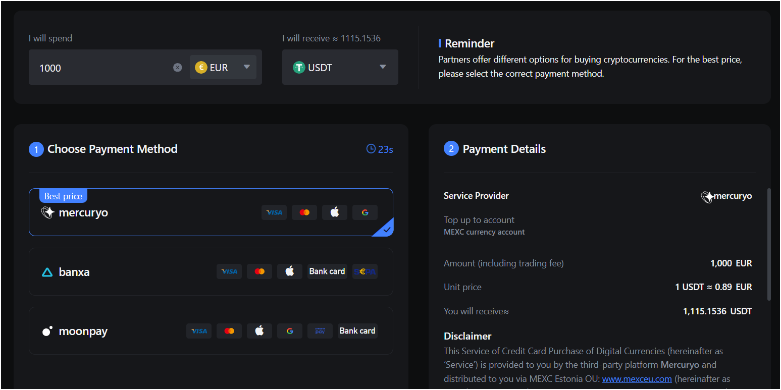 | Payment Methods | Credit/debit cards, bank transfers (SEPA and SWIFT), and P2P trading with local currencies (Only crypto without KYC0 |